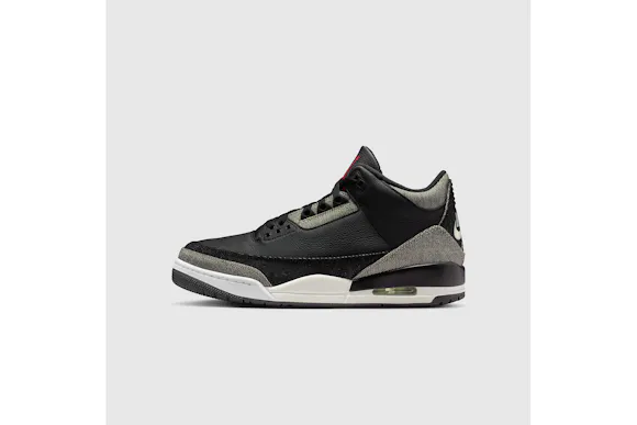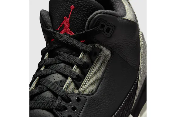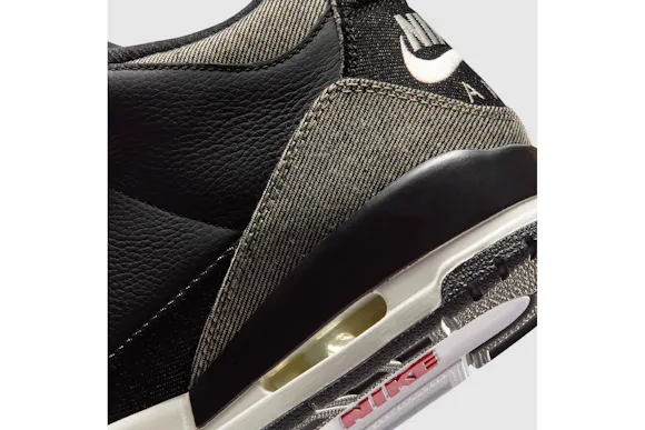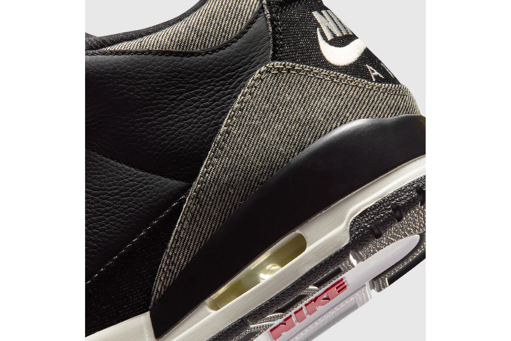 A fresh spin on the AJ3. This style features pebbled black leather, black denim panels and backside black denim that reveals lighter grey tones. We finished them with a sail midsole and an embroidered black denim heel piece that features Nike Air embroidery–a first-of-its-kind construction detail.