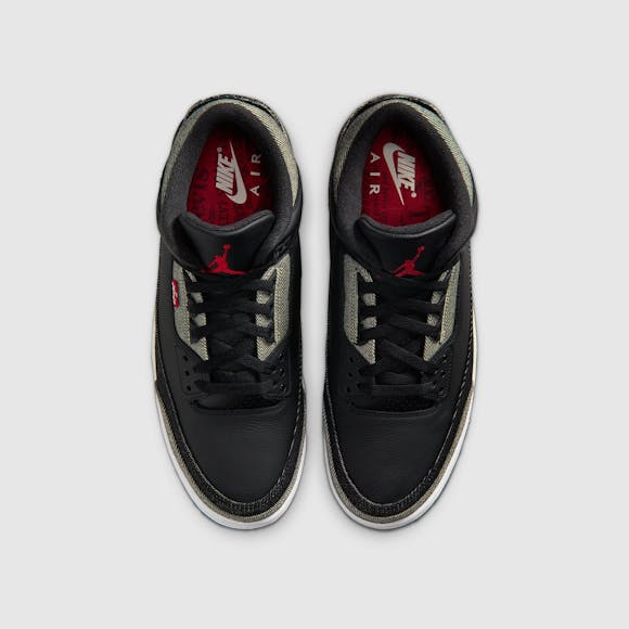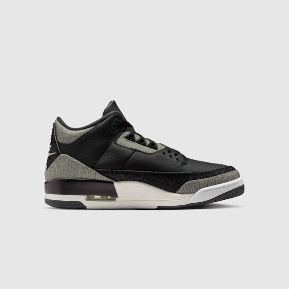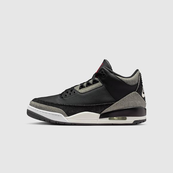 A fresh spin on the AJ3. This style features pebbled black leather, black denim panels and backside black denim that reveals lighter grey tones. We finished them with a sail midsole and an embroidered black denim heel piece that features Nike Air embroidery–a first-of-its-kind construction detail. A fresh spin on the AJ3.