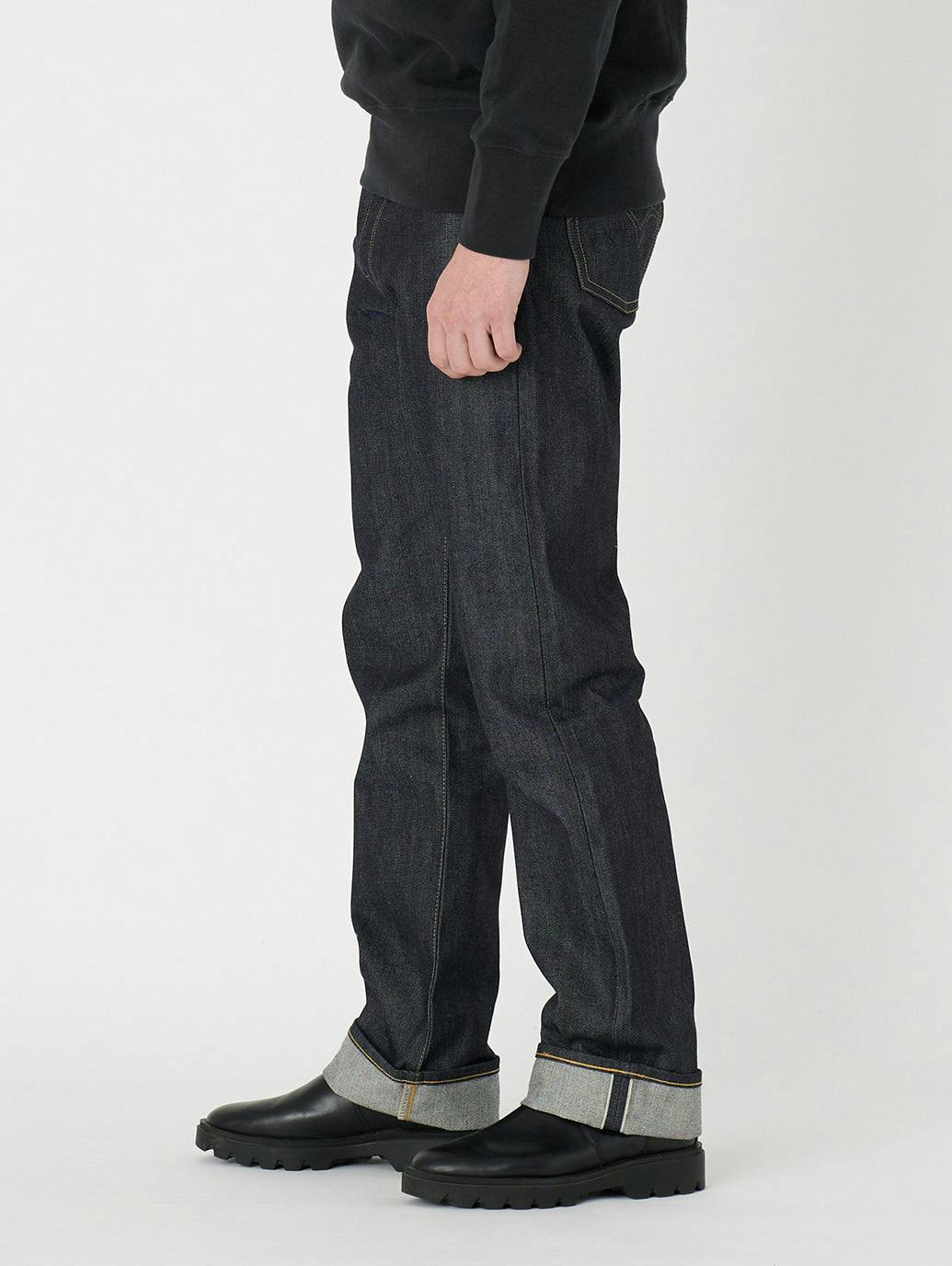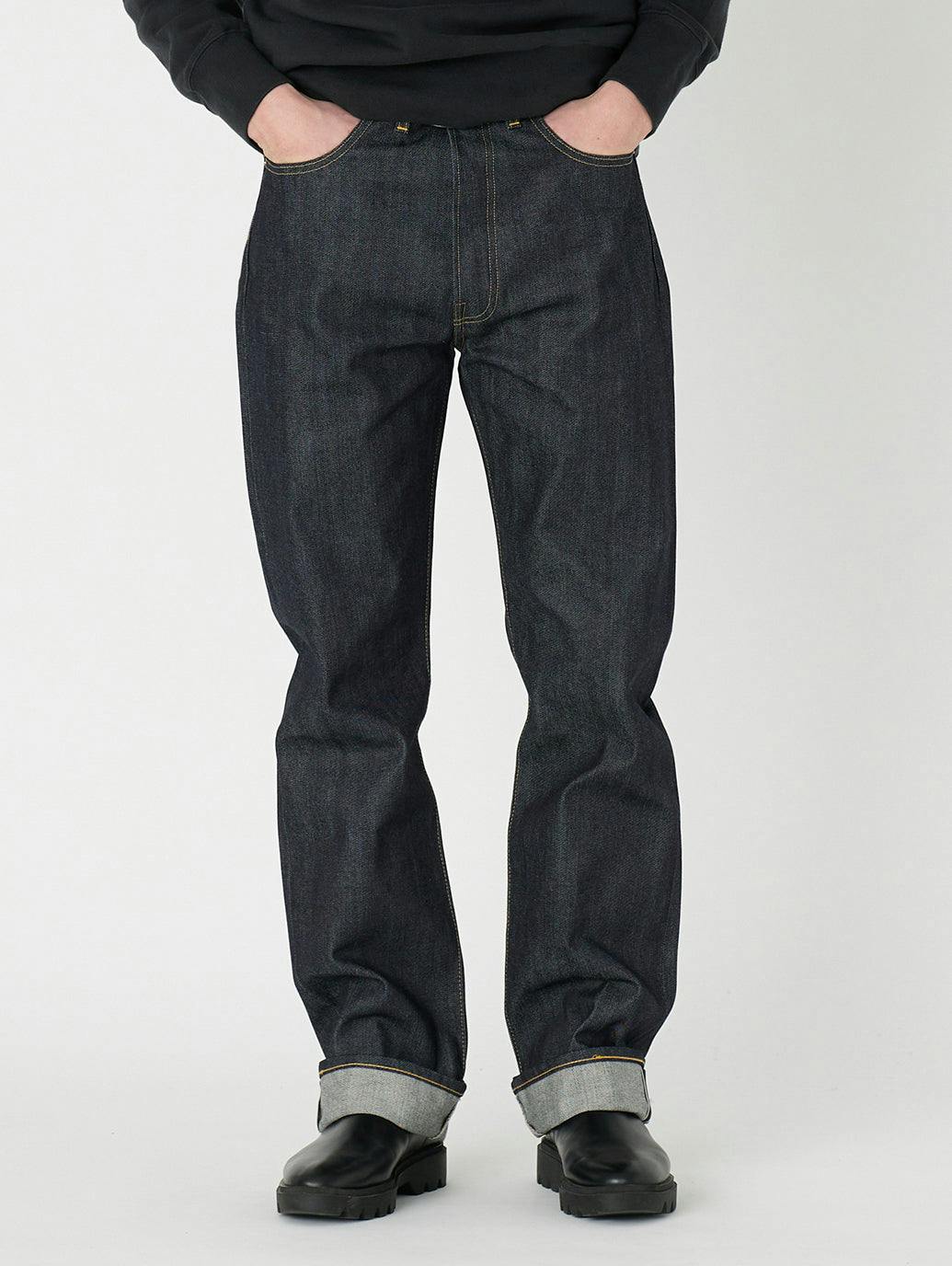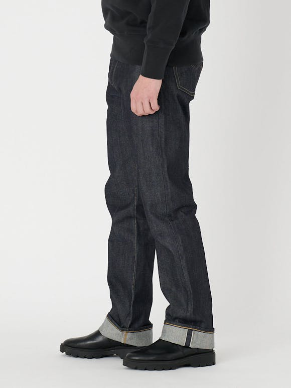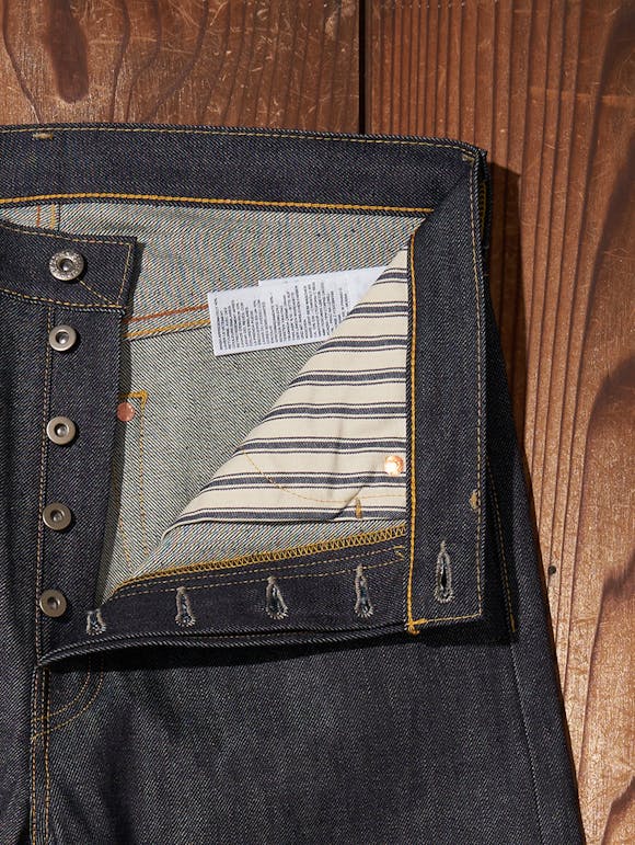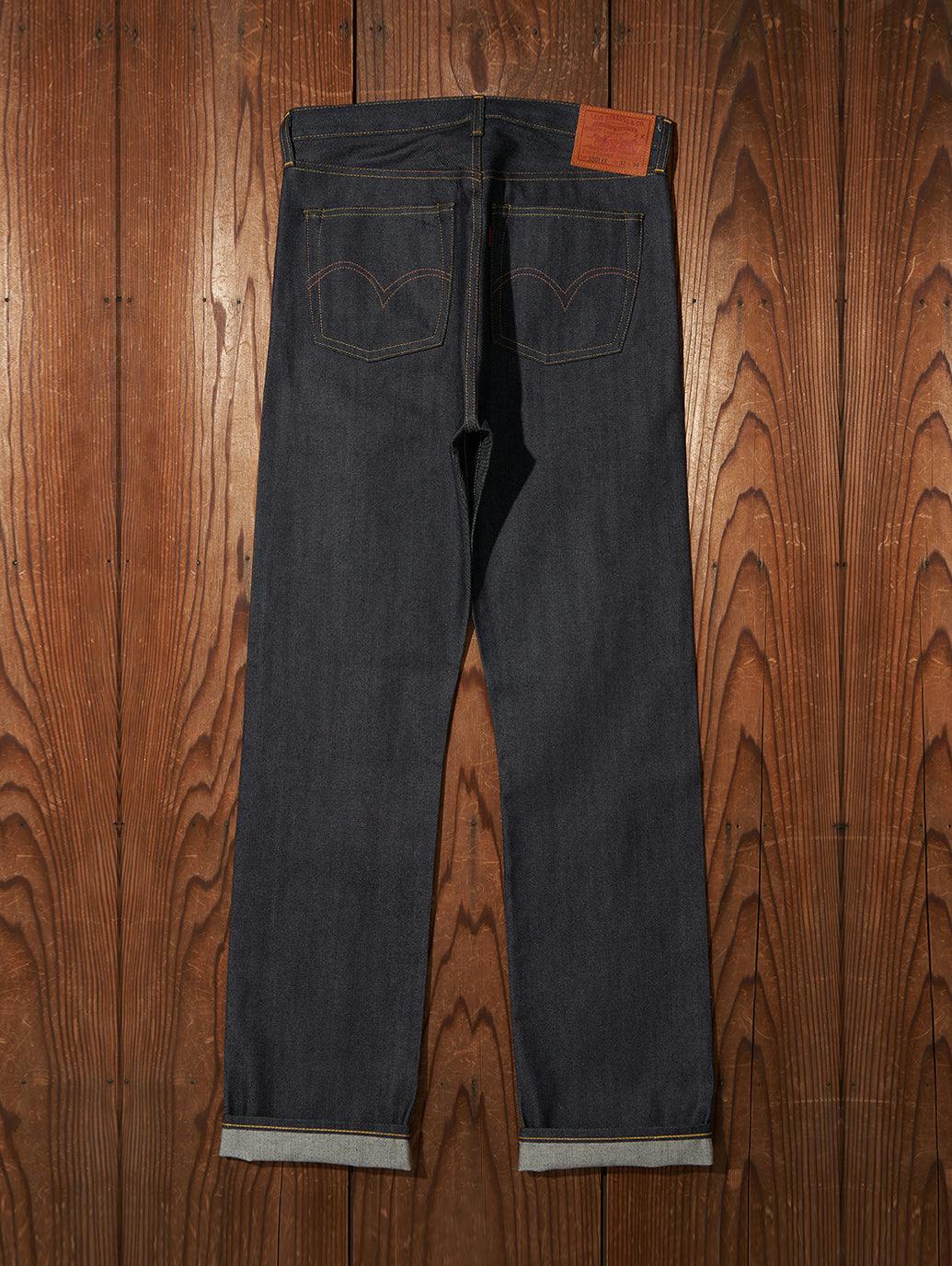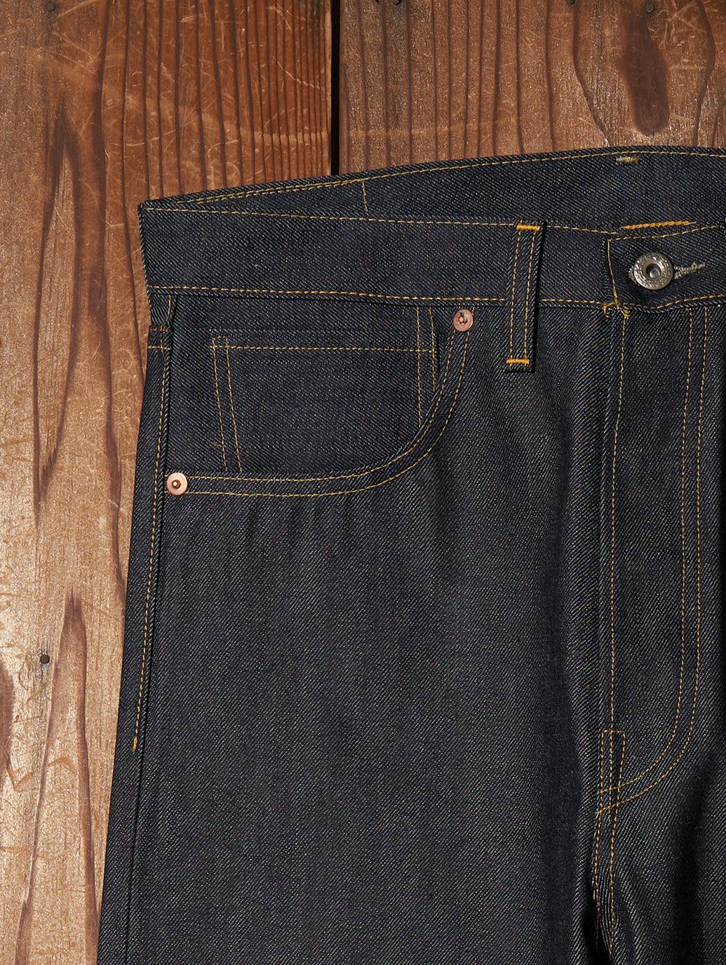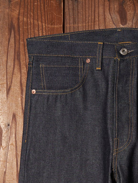 第二次大戦時代のジーンズを再現することで、資材節約の時代を反映させています。オリジナルでは、ウォッチポケットリベット、クロッチリベット、バックウエストシンチが省略されていました。
